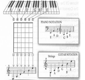 To begin, find the E note of the piano and then play the sixth string or E note on your guitar. Turn the tuning peg so that the sixth string on your guitar sounds like the E on the keyboard. Do this with all the stings on the guitar.